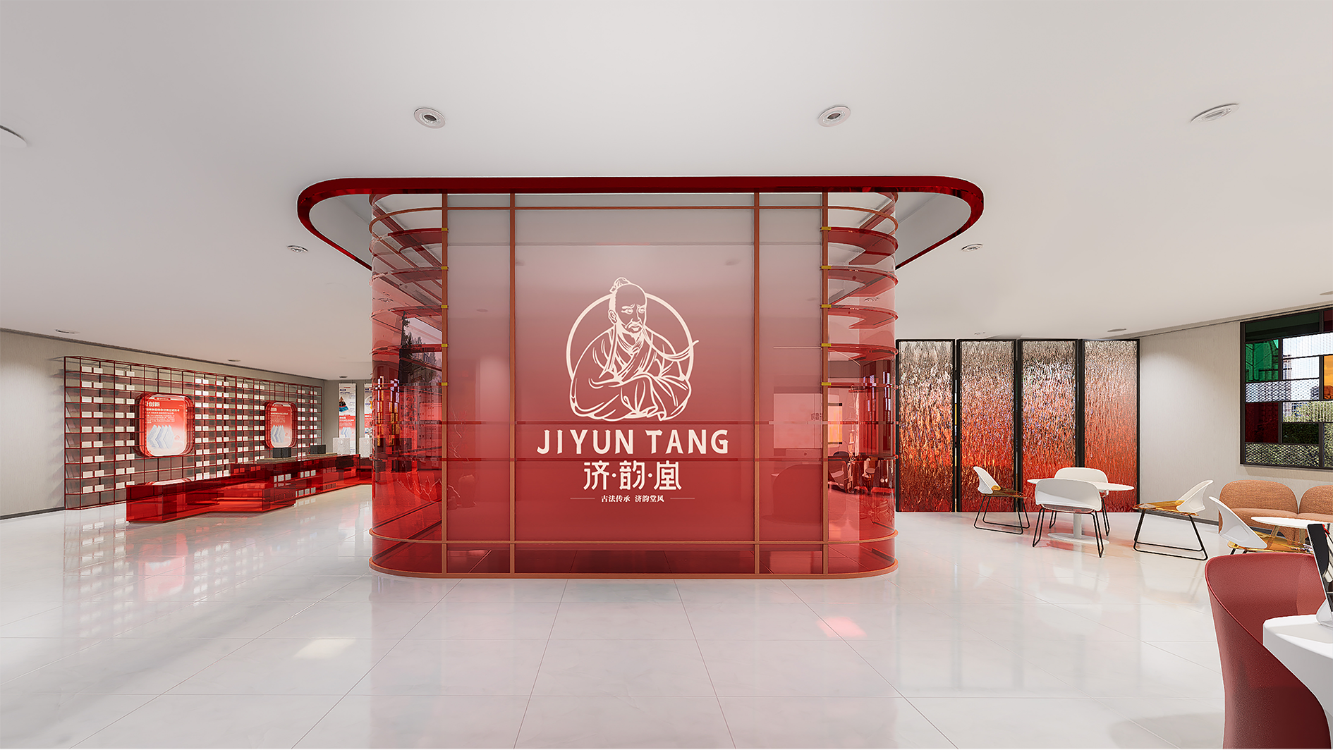 文化展示区突出“济韵堂”品牌文化形象,通过标识性强、意蕴深厚的视觉元素,勾勒出养生美学的空间轮廓。设计将历史沉淀与现代语言巧妙融合,营造兼具文化厚重感与沉浸体验性的静谧氛围,传递品牌一贯的温润与关怀。