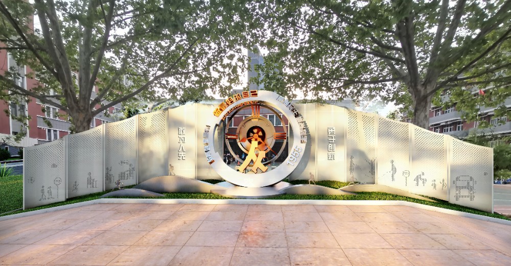 设计将校园空间划分为入口区、北侧主题景观区、北楼、南楼及连廊五大板块,实施主题一体化叙事策略。入口区域以树木与时钟艺术装置相结合,喻示“十年树木,百年树人”的育人使命,隐喻学校七十年历程与时间见证;该装置不仅传递学生“向下扎根、向上生长”的生命力与“向内求索、向外发现”的成长维度,也强化“惜时如金”的行为引导。