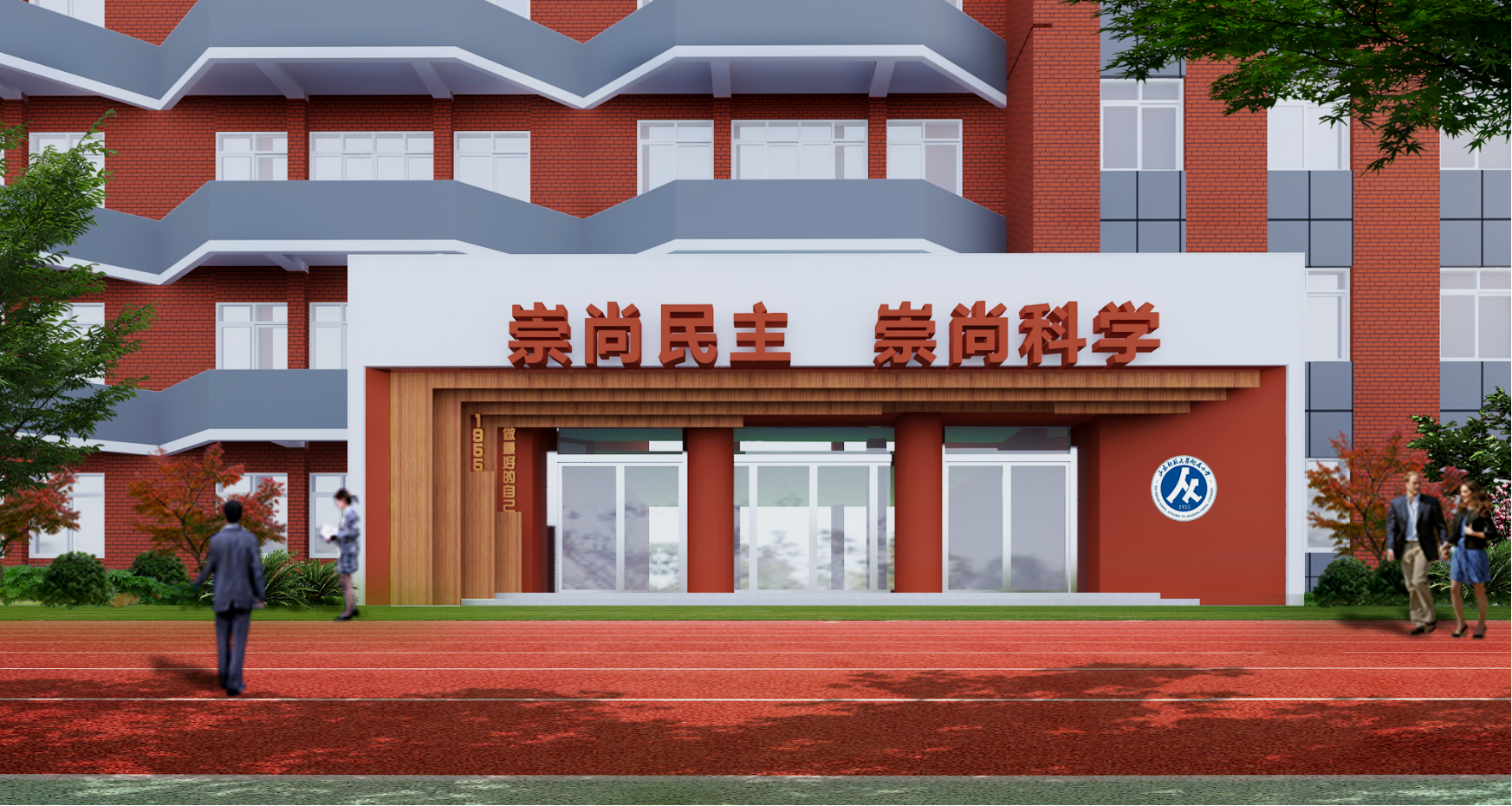 北侧主题景观以校魂“雷锋精神”为核心,构筑沉浸式学习场域,通过主题雕塑、事迹展陈与学雷锋行动实录等内容,焕发榜样力量与时代精神。北楼侧重呈现校园文化与历史传承,南楼聚焦教学成果与创新实践,连廊则打造优秀毕业生形象长廊,形成“一区一主题、楼楼有共鸣”的氛围序列,在多元场景中构建统一而深厚的校园文化认同。