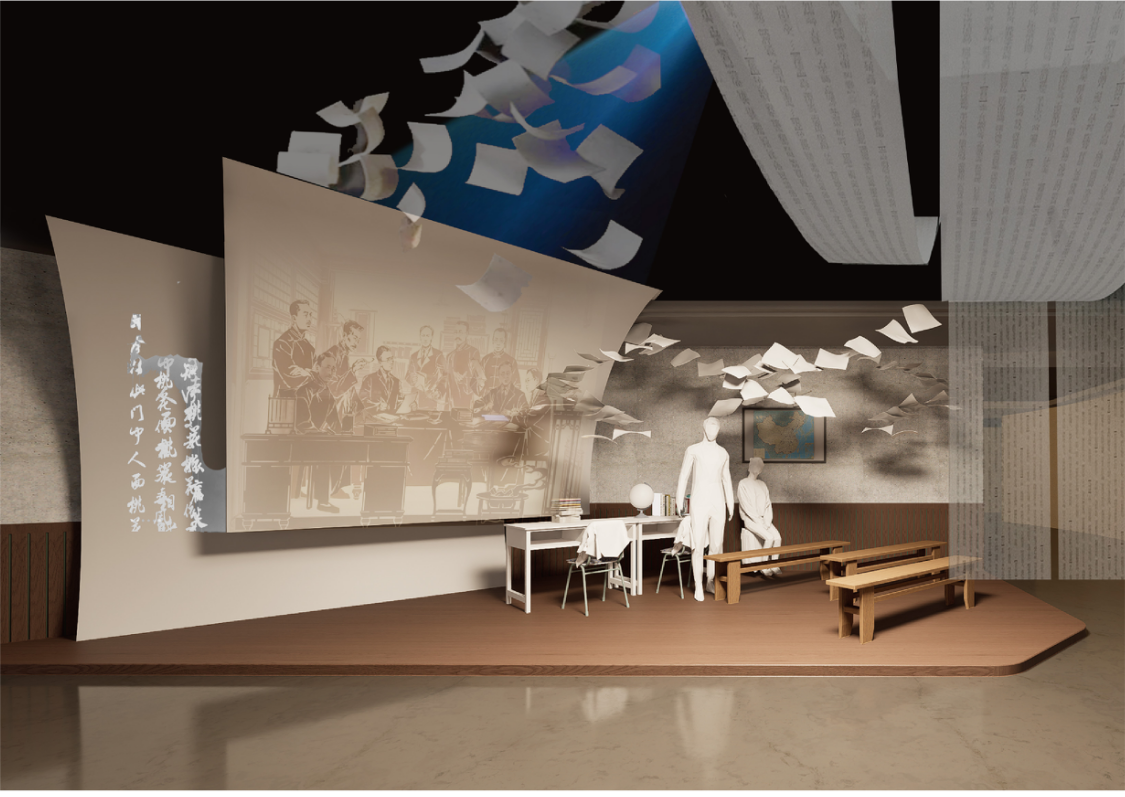 序厅以“墨韵流光”为主题,通过弧形屏幕动态呈现学校宣传影像,结合墨子光学元素、榫卯结构细节与历史长卷视觉背景,构建兼具科技感与文化张力的迎宾空间。
