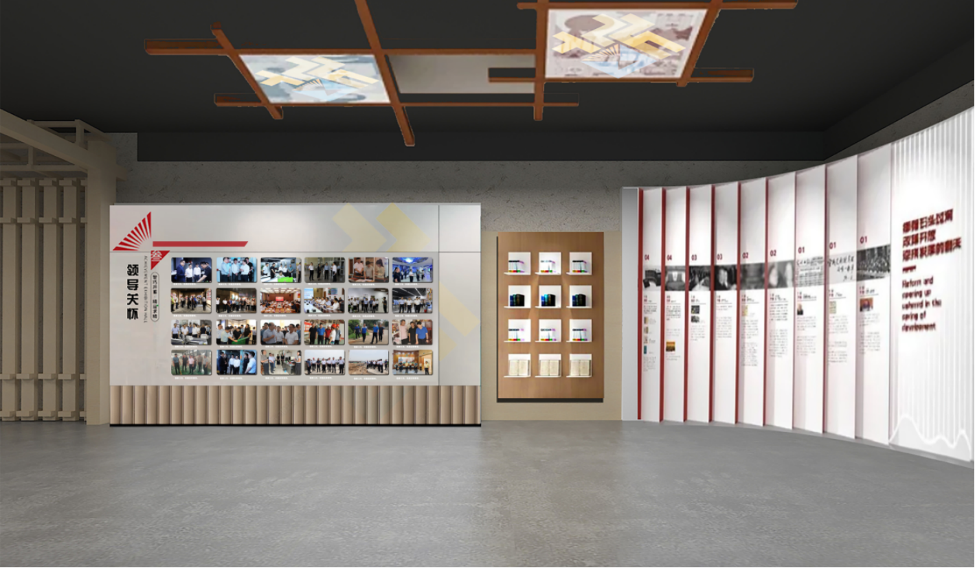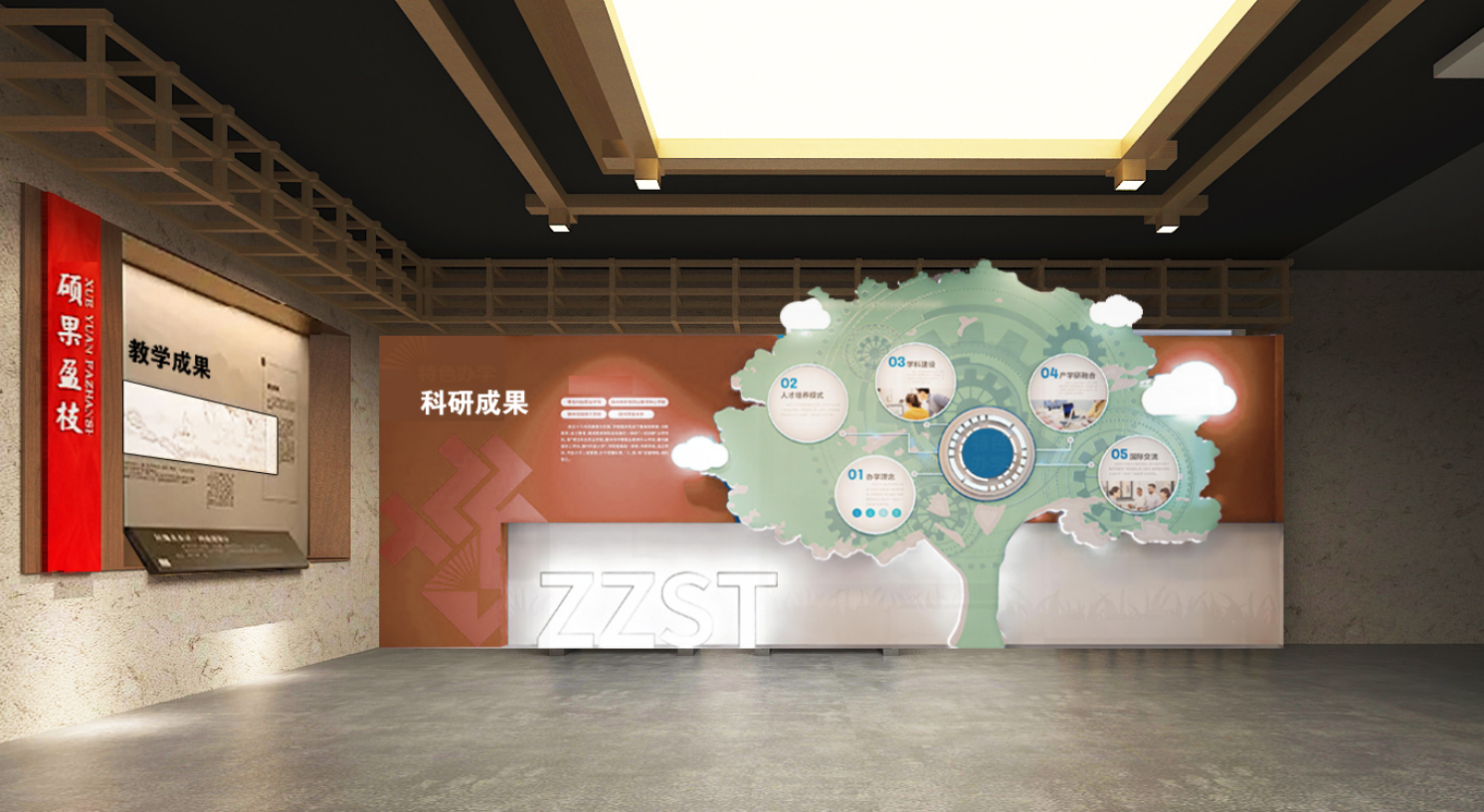 成果展厅综合运用海报系统、展板架构、实物模型及数据可视化界面,清晰呈现学校的办学理念、人才培养、校企协同与学科建设成果,凸显教育实践的厚度与创新成果的亮度。